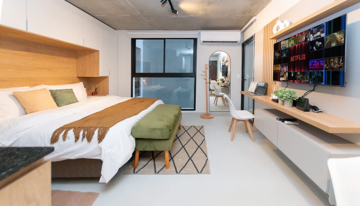 Stay in a stylish studio just steps from top malls in Asunción. This modern building features a rooftop pool, gym, cinema, coworking space, and BBQ areas. Perfect for short stays in a safe, vibrant location. Only 250m from Shopping del Sol. 24-hour security and front desk.