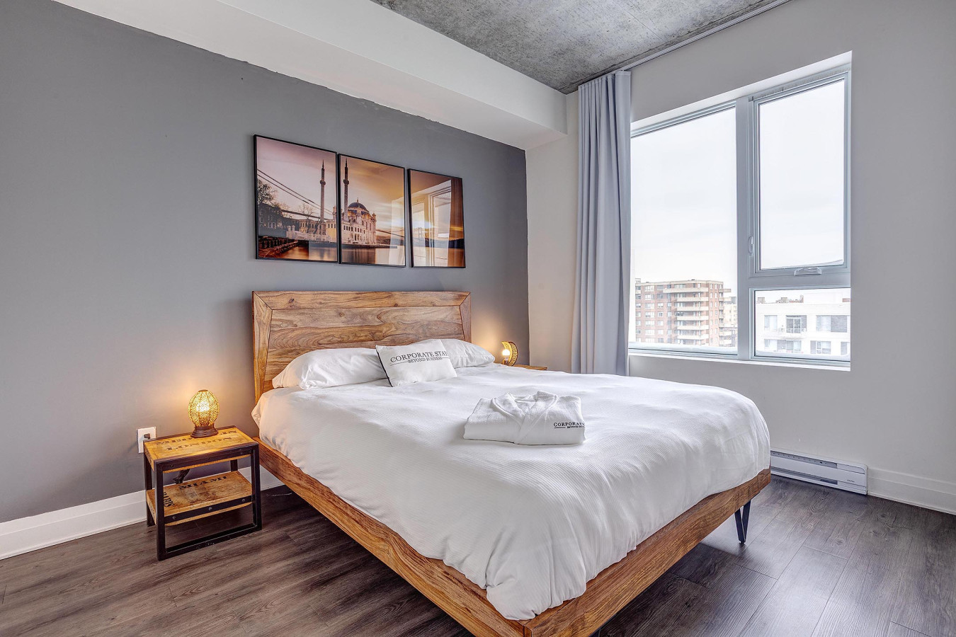 Relax in a bright and inviting living space with picturesque views of Montreal's skyline. Enjoy a plush sofa, Smart TV with streaming capabilities, and a serene atmosphere ideal for unwinding after a long day.