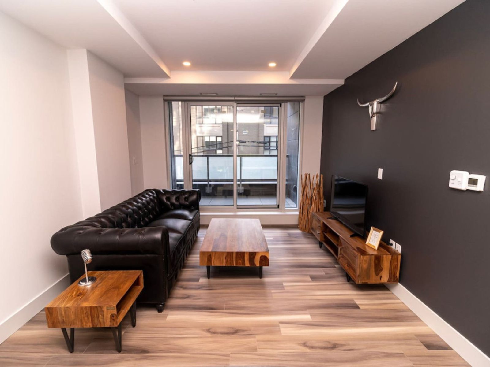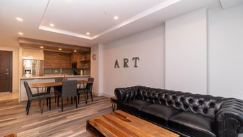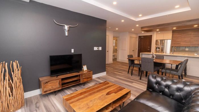 Unwind in the stylish living room with expansive skyline views. Settle into the cozy seating and enjoy your favorite shows on the Smart TV.